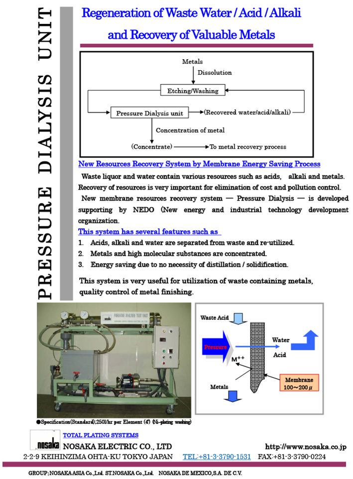 | 適用分野 1)めっき水洗水からの酸回収再利用、金属分濃縮分離。 2)各種エッチング液の再生(液の長寿命化)。 3)ステンレス酸洗廃液からの酸回収再利用。 4)アルミ前処理液(硝酸/フッ酸)の再生(浴の長寿命化)。 5)各種酸廃液からの酸の回収と金属分離・回収、排水量の削減。 6)他の既存プロセスとの併用により、銅めっきやニッケルめっき水洗水からの水回収・再利用と金属塩類の濃縮・分離・回収。 |